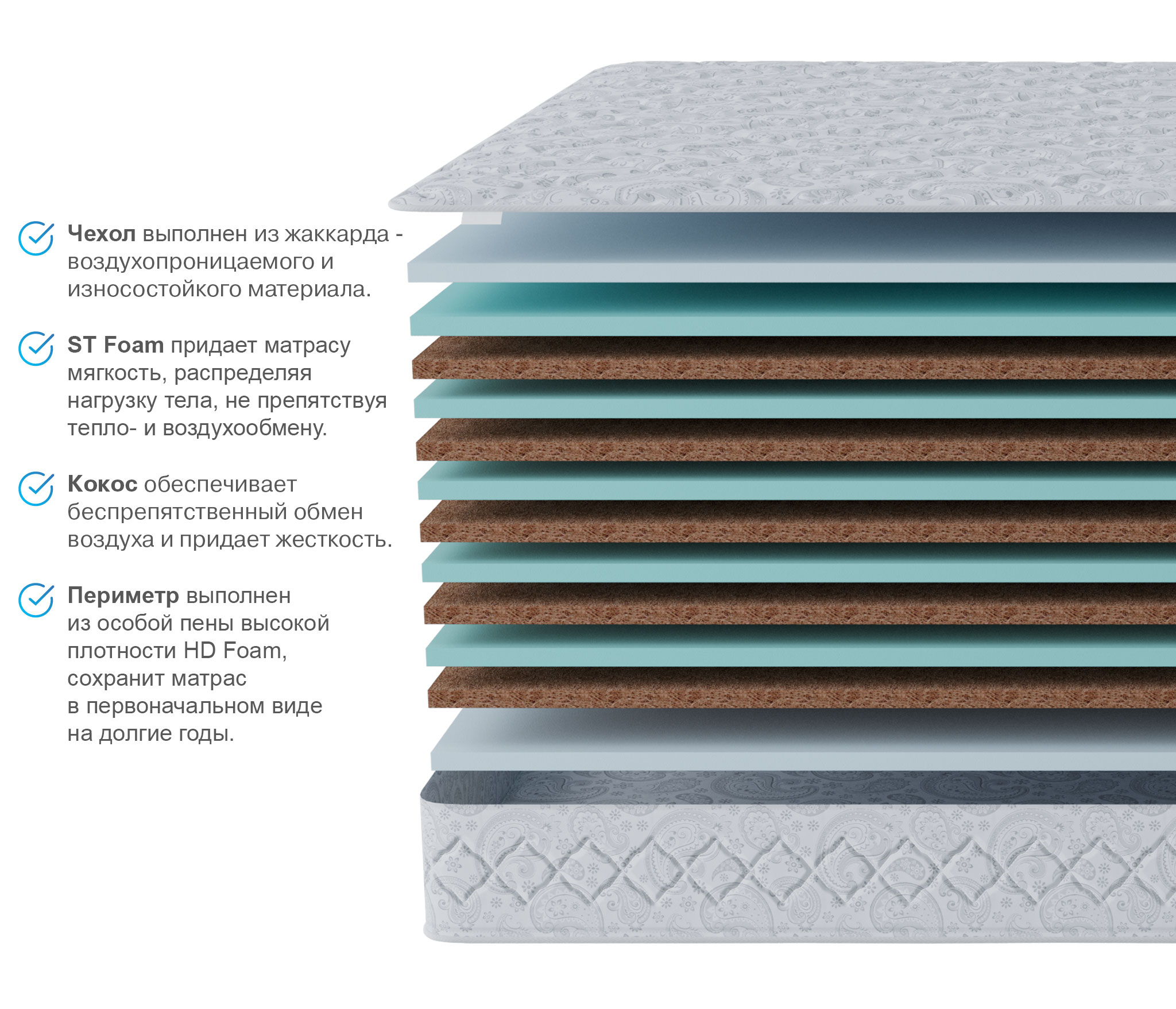 Чехол: Жаккард высокой плотности, стеганный на 15 мм ППУ