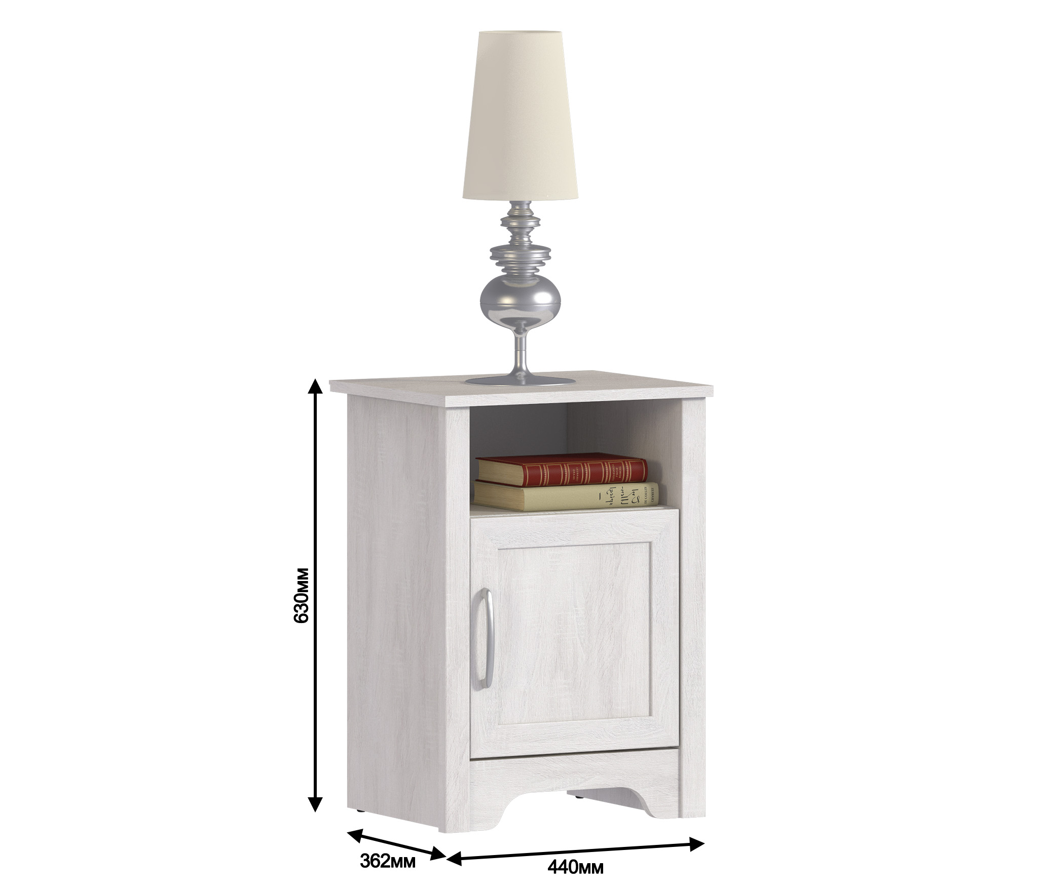 Габаритные размеры – ширина 44 см, высота 63 см и глубина 36 см. Сразу под столешницей расположена открытая полка, а под ней вместительное отделение с отдельной дверцей.Корпус тумбы выполнен из современного и прочного КДСП, рамочные фасады выполнены из МДФ. Цвет отделки - Дуб Сонома белый.