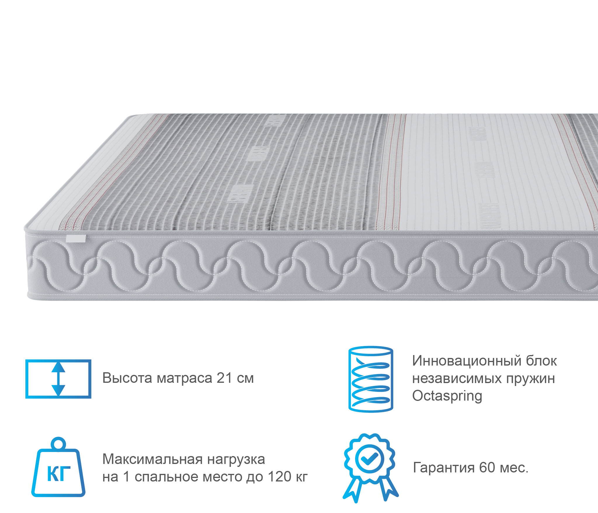 В основе матраса пенные пружины Octaspring высотой 10 см, что позволяет максимально ощутить мягкую динамичность пружины и ее индивидуальную работу. За счет этого увеличивается фаза глубокого сна и значительно снижаются нежелательные пробуждения, влияющие на восстановление организма.