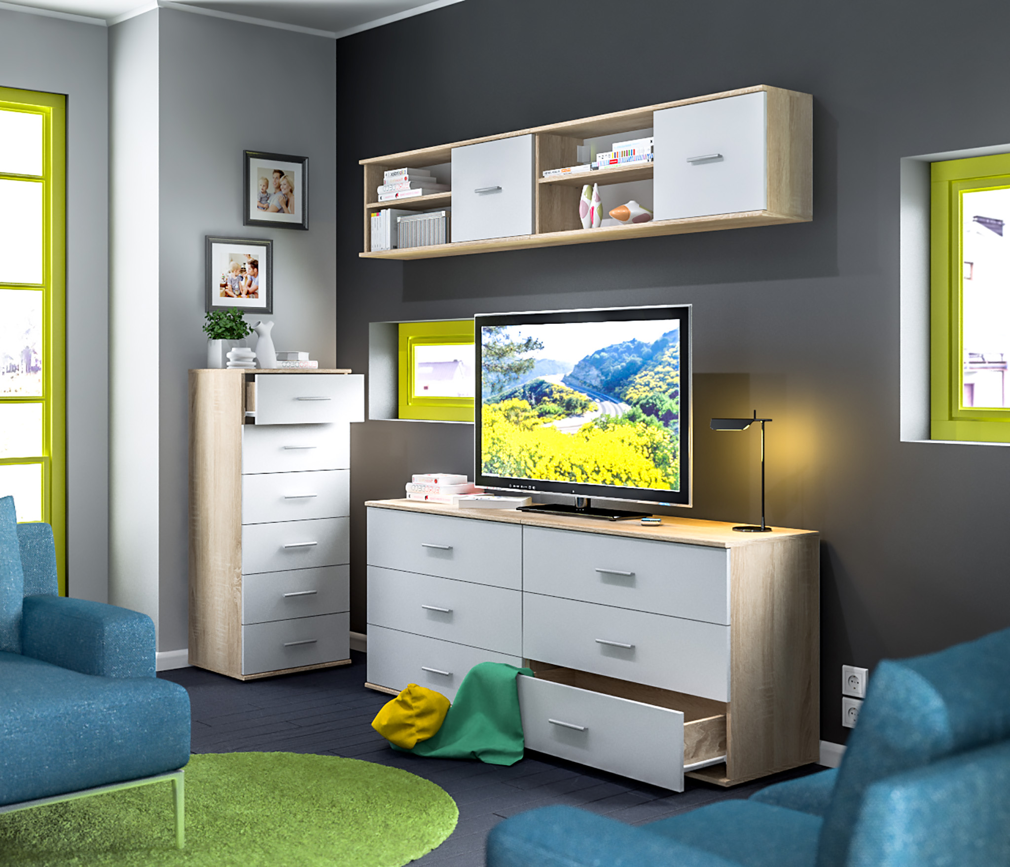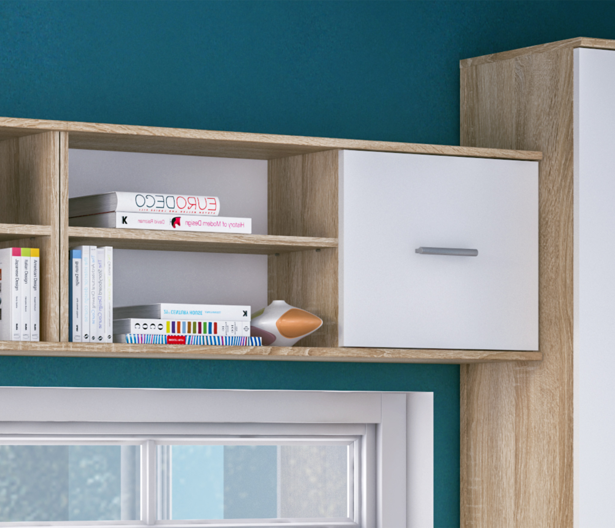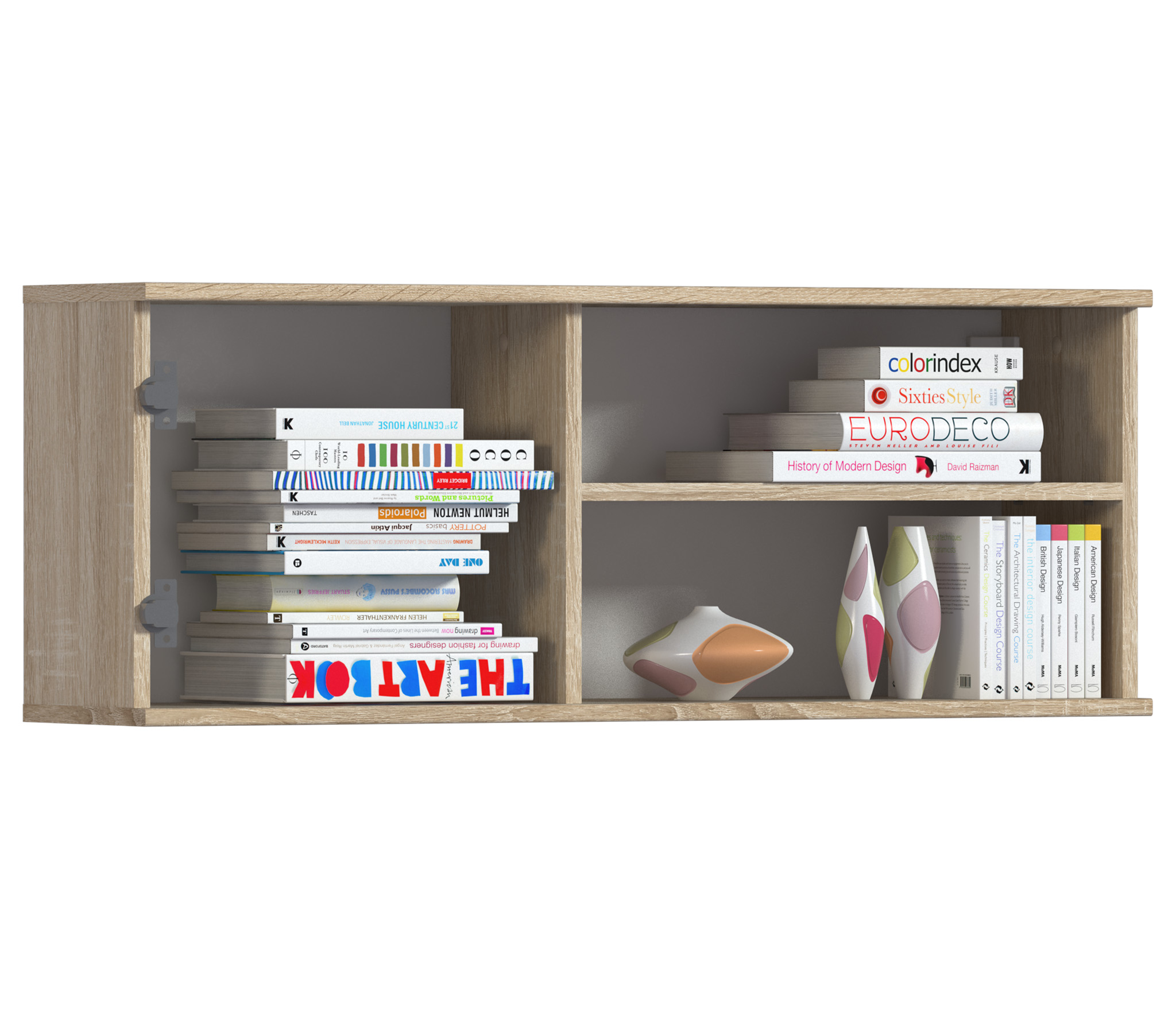 Габаритные размеры – ширина 103 см, высота 39 см и глубина 24 см. Полка состоит из двух открытых отделений, расположенных одно над другим и одного отделения за глухой дверцей.Выполнена полка из современного материала. .Полка крепится к стене при помощи дюбелей, которые входят в комплект.