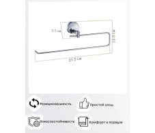 Изделие монтируется к стене при помощи надежного крепежа. Держатель не поддается коррозии, не деформируется и не отрывается от поверхности. Использованное влажное полотенце можно повесить обратно на держатель и аккуратно распрямить для высыхания и дальнейшего использования. Современный эргономичный дизайн держателя отлично сочетается с любыми аксессуарами в ванной комнате.