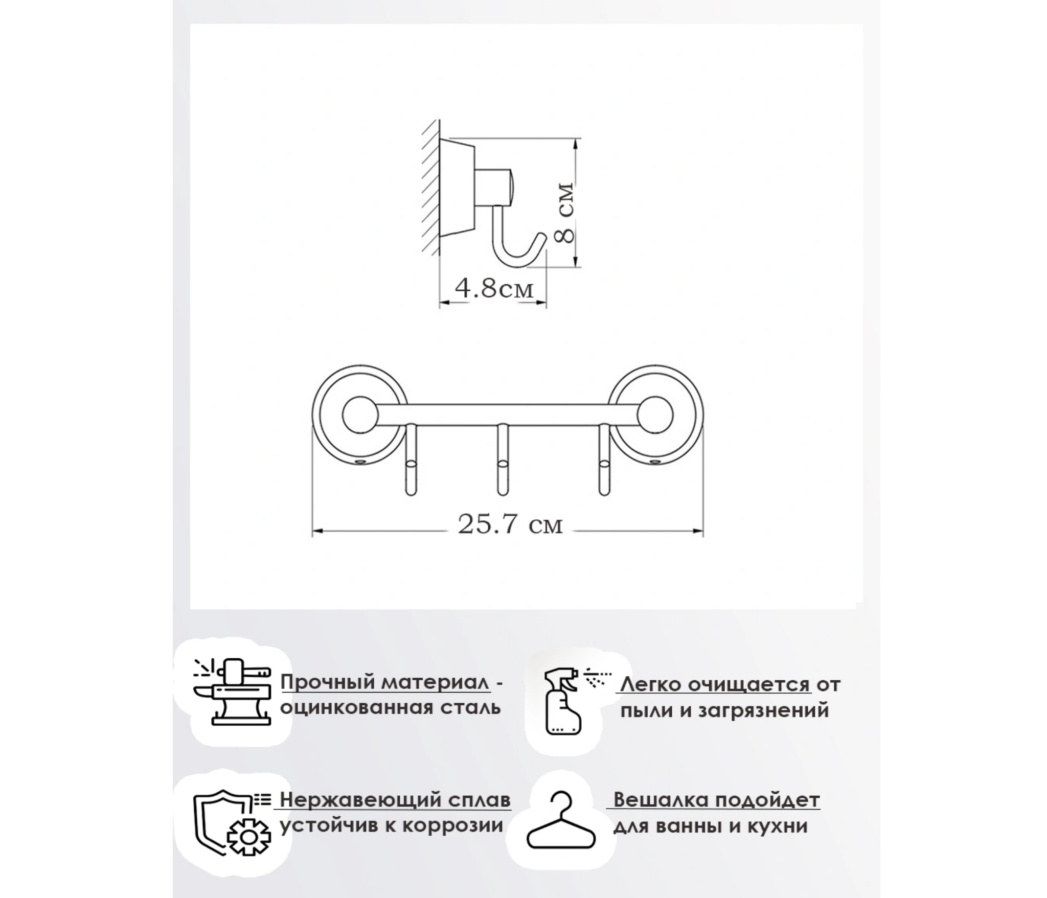 Вешалка изготовлена из материала, устойчивого к постоянному воздействию влаги. Монтаж с помощью сверления надежно зафиксирует аксессуар на любом стенном покрытии. Незаменимый аксессуар для полотенец.