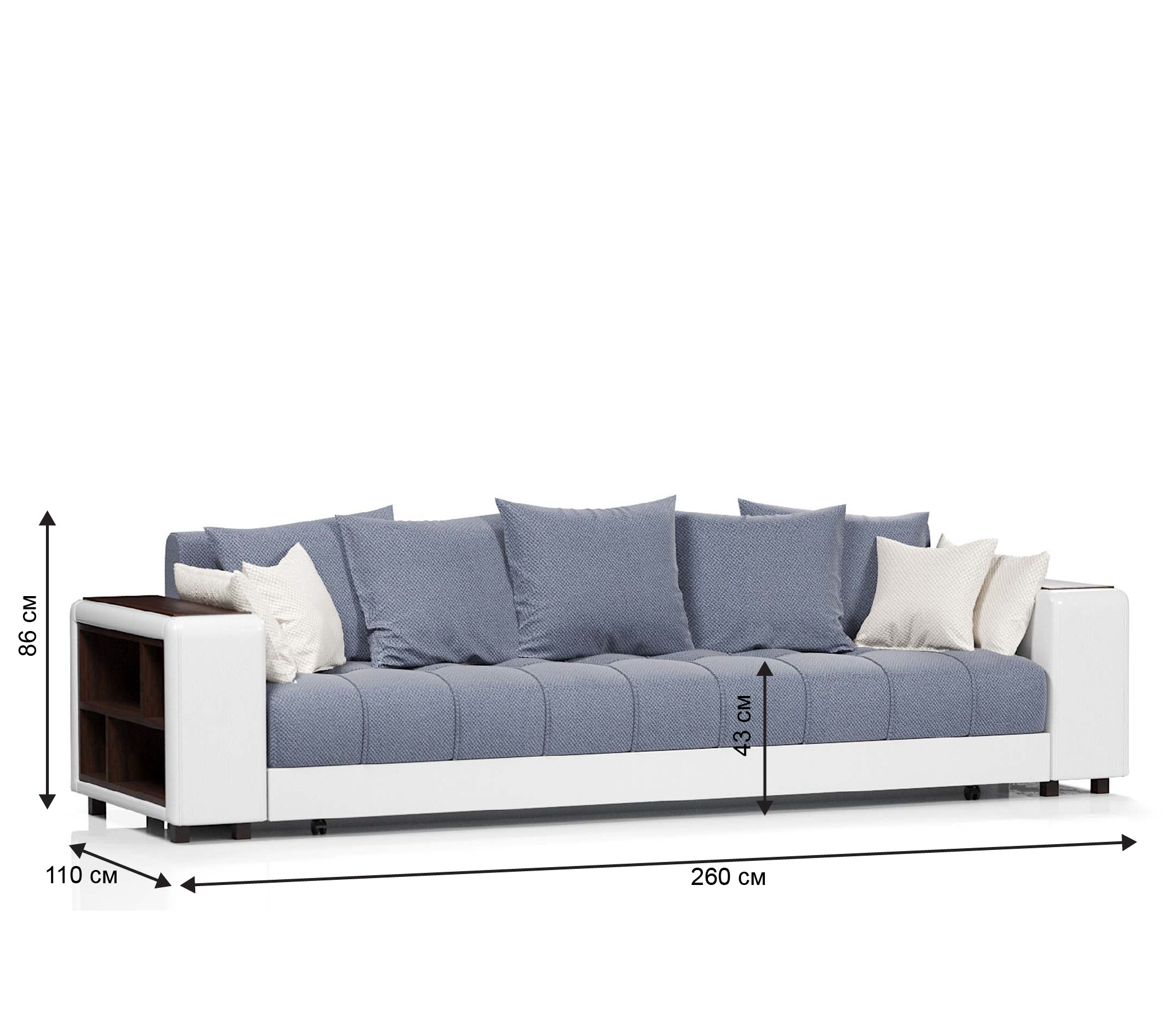 Прямой диван Дубай это отличный выбор для тех, кто планирует создать уют в своей квартире. Модель имеет выдержанный дизайн без элементов, которые перегружают её. С каждой стороны в подлокотниках установлены полки, куда вы сможете складывать различные мелочи, пульт итд.